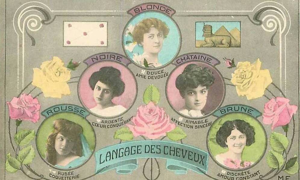 The postcard probably dates from around 1910, but I include it anyway. I refer to the idea of “the language of hair” in Paris Red, though in a different format.