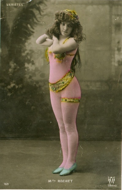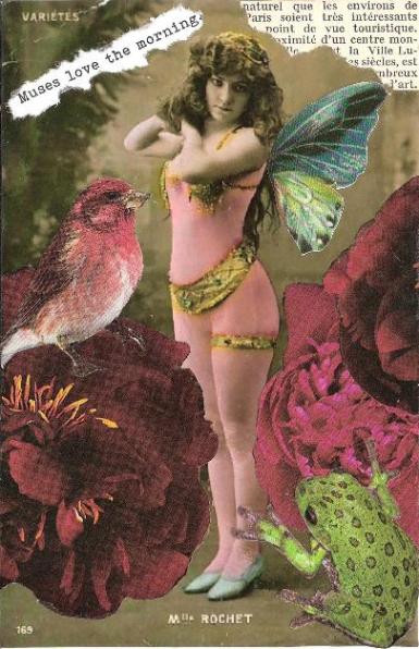 This is another collage I made from a 1908 postcard I found of Mlle Rochet, a young dancer and performer. In this card, someone has tinted her shoes a brighter blue than in postcard #1, and they’ve given her a candy-pink body stocking. I love the thoughtful, unsmiling expression on her face, and I love that she seems to be fiddling around with the strap of her costume. In this collage I was exploring my notion of and feeling for the fictional Victorine Meurent I wanted to create as a character, but I was also trying to send myself some kind of gentle message about work habits and creativity. That’s why I included the Muses love the morning phrase.