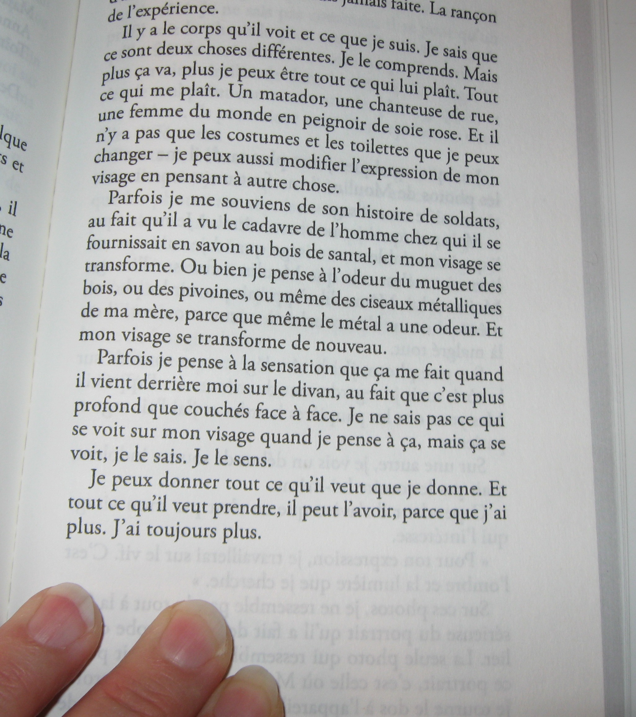Maybe it seems funny, but I just love the phrase “bottines de putain.” I love the sounds of the “b” and the “p.” My work has been translated before into German and Norwegian, but I since I don’t speak those languages, I could only marvel at the appearance of things. This time I can read the translation. I can experience it.
