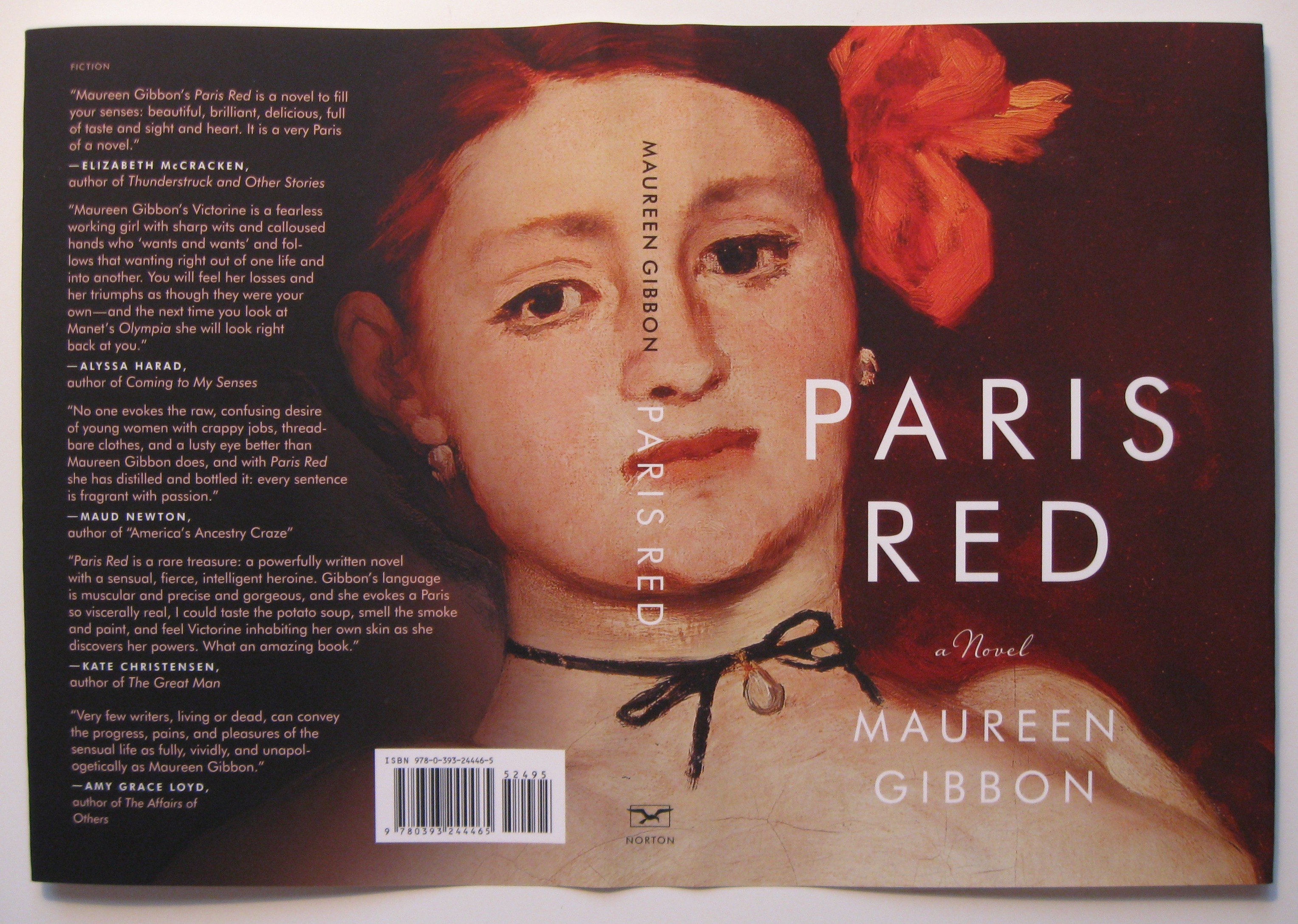I wrote the first draft of Paris Red in the summer of 2012. I’ve been waiting for the book for a long time. Yet it still overwhelmed me to see the finished edition. For one, I didn’t know the jacket image would show all of Victorine’s face, using a detail from Olympia. Unfurled, the jacket looks like this: